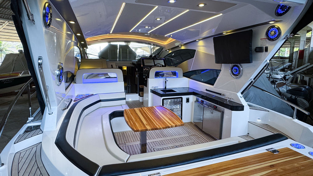 FAROL | CHUVEIRO NA PLATAFORMA | PLATAFORMA MÓVEL | STROBO | AR CONDICIONADO | TOLDO STOBAG | FLAPS | GUINCHO | FECHAMENTO TOTAL | TECA NA PLATAFORMA | TECA NO COCKPIT | TAPETE INTERNO | TOMADA DE CAIS | BAR EXTERNO | CAIXA DE GELO | GELADEIRA | FOGÃO | MICROONDAS | TV | CONTROLE TV | SOM | TOMADA 12V INTERNA | GPS | RÁDIO VHF | AUTO FALANTES | CONTROLE SOM NO PAINEL | JOYSTICK
